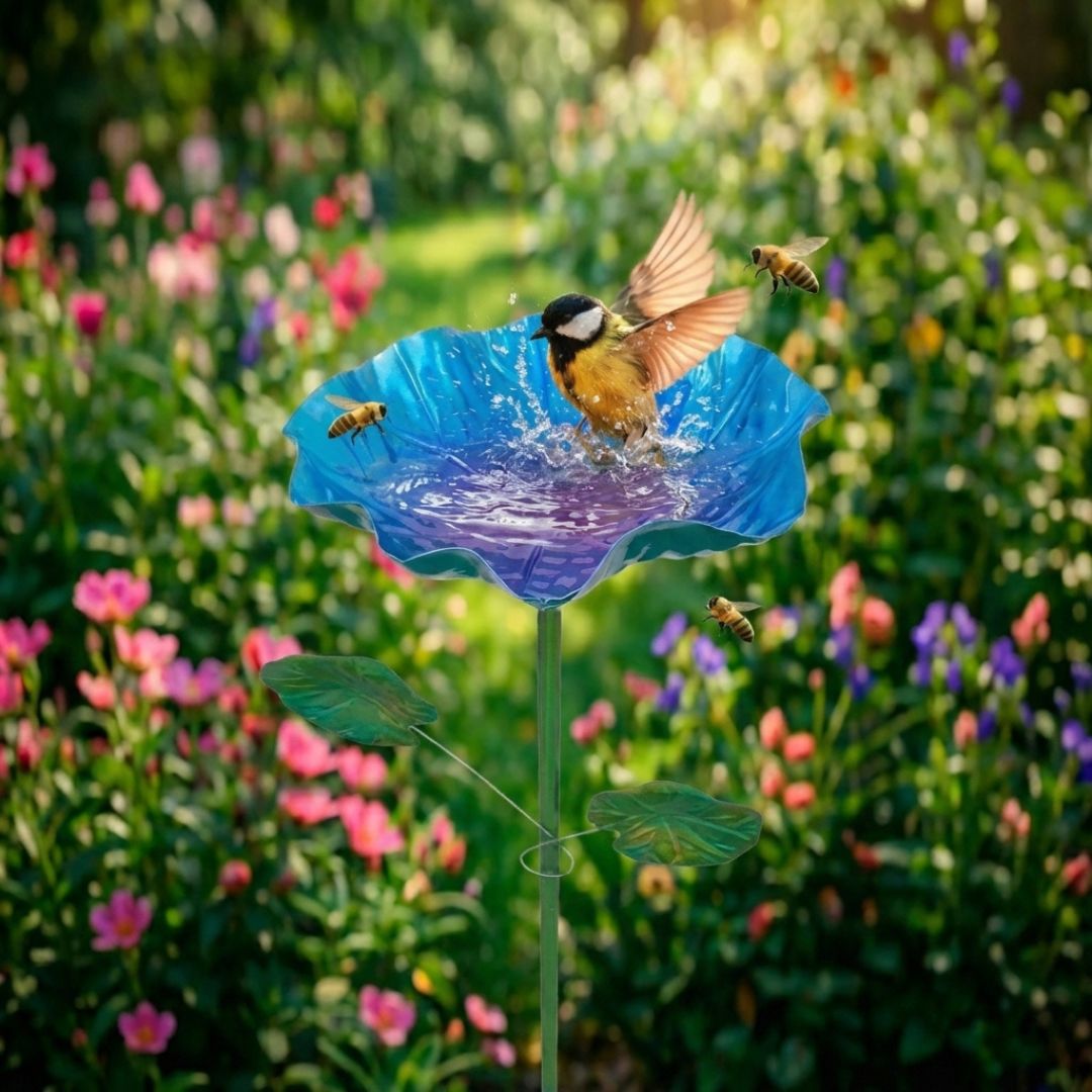 Backyard birds are always looking for safe places to drink and cool off. The deep bowl center of this flower stake doubles as a convenient mini bird bath. Simply add a small amount of water and watch local birds stop by for a refreshing drink. It transforms your garden into a welcoming wildlife spot while adding gentle natural activity to your yard. Bird lovers especially appreciate how a small water source can attract more feathered visitors and bring daily life and movement into the garden.